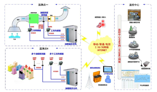 油煙監測系統是為滿足環保行業特殊需求,利用物聯網感知技術、GPRS 無線通信技術等開發的一套高性能的集油煙監測、數據采集、數據傳輸為一體的系統。可對企業油煙排放濃度、凈化器運行狀態、風機運行狀態等指標進行在線監控,從而將油煙治理設施工況數據與油煙濃度數據統一起來,為環保局提供直接有效且真實的油煙排放狀況的專用油煙監測設備。