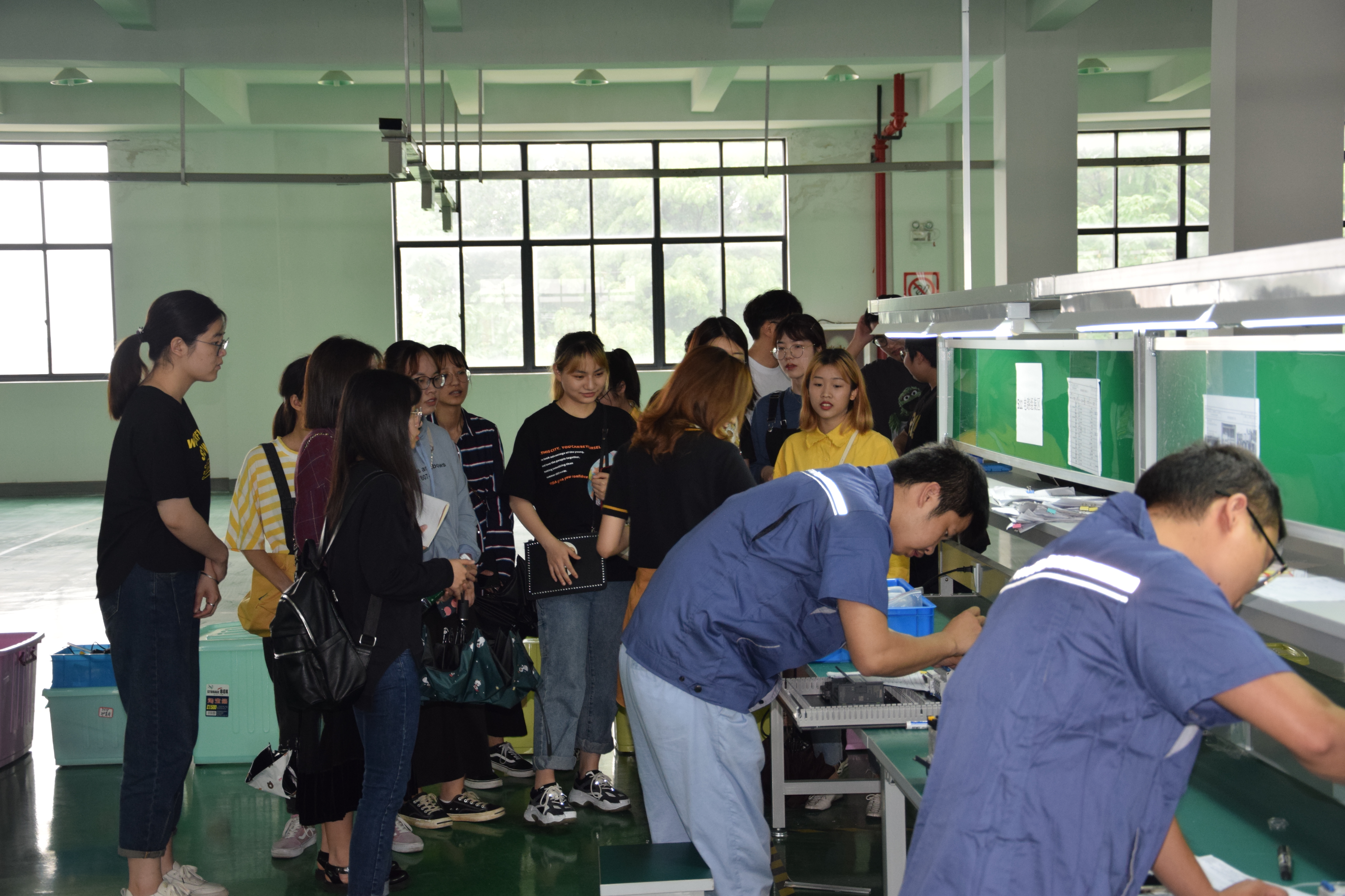 理工大科藝院師生參觀車間生產人員工作。